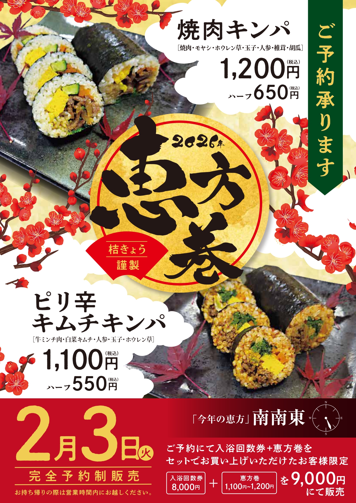 入浴回数券1冊+恵方巻1本セットをご予約いただいたお客様に限りセット価格¥9000(100円~200円お得)で販売いたします。