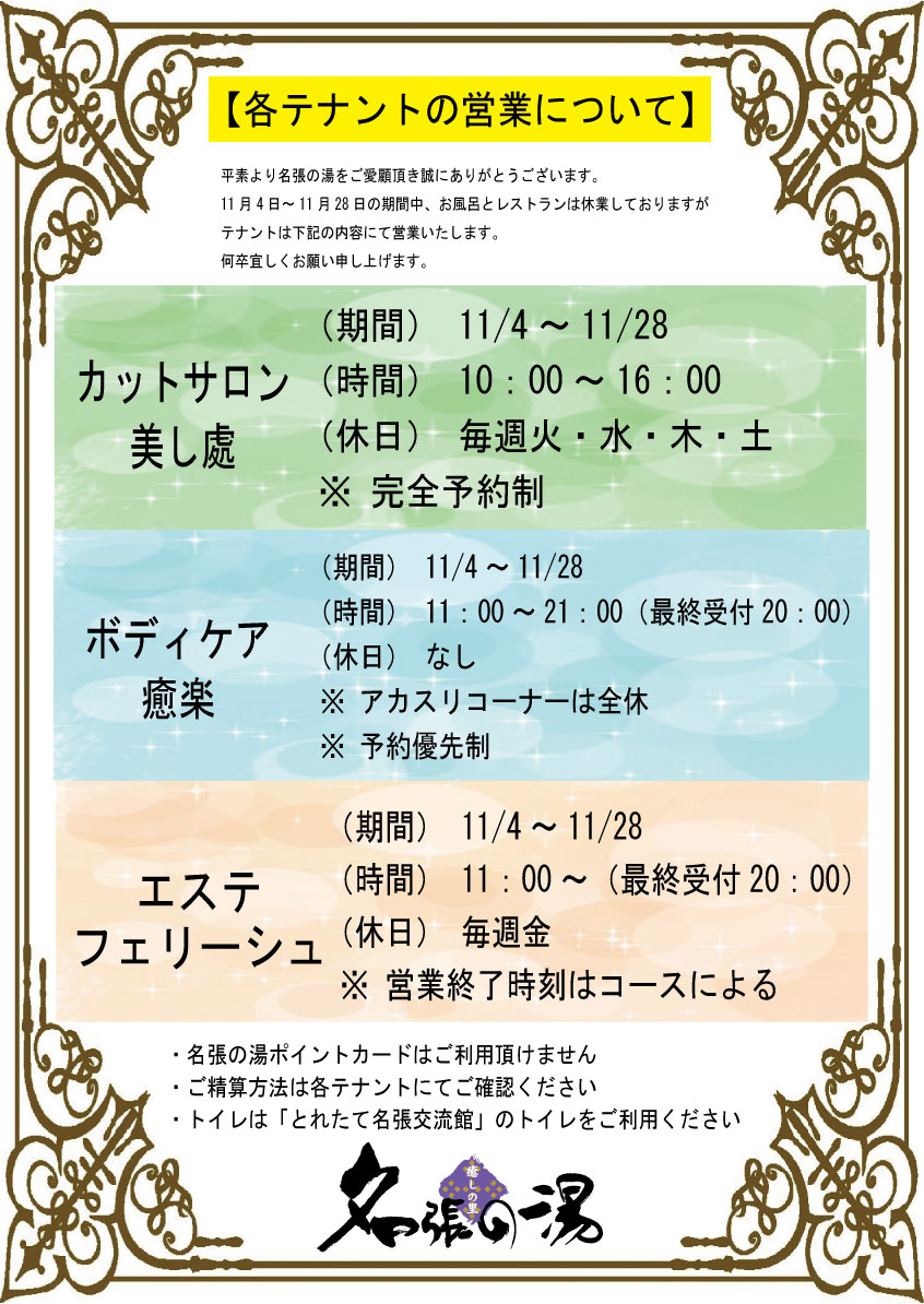 いつも名張の湯をご利用いただきまして、誠にありがとうございます。 11月の休業期間中の各テナントの営業に関しては、下記画像の通りです。 詳細は、大変お手数ですが各テナントに直接お問い合わせください。 ご不便をおかけしますことを重ねてお詫び申し上げます。 宜しくお願いいたします。