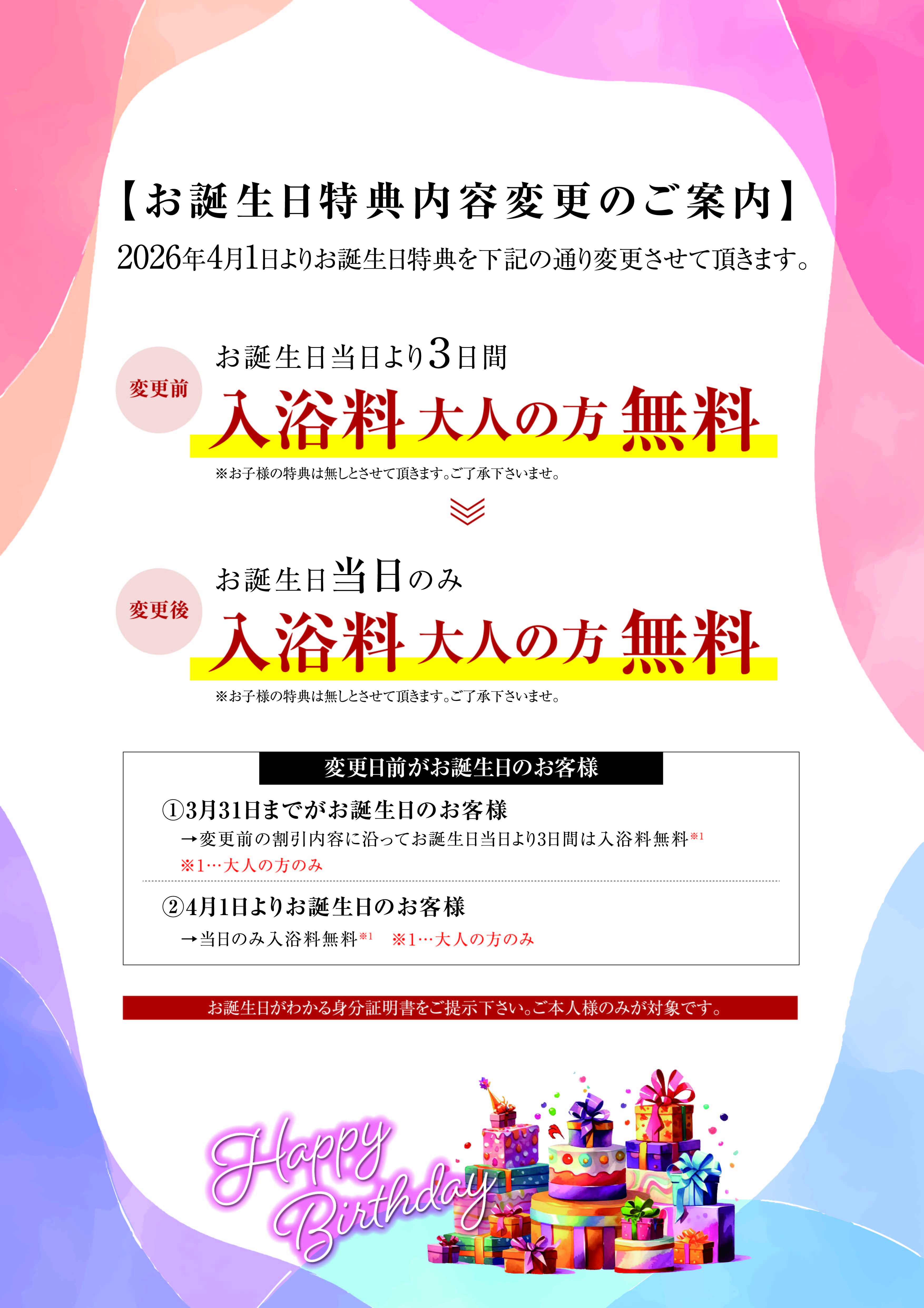 2026年4月1日より、お誕生日特典を下記の通りに変更いたします。 お誕生日の当日のみ、大人の方のみ対象に、当日の入浴料を無料で承ります。 ※お誕生日がわかる公的な身分証明書をご提示くださいませ