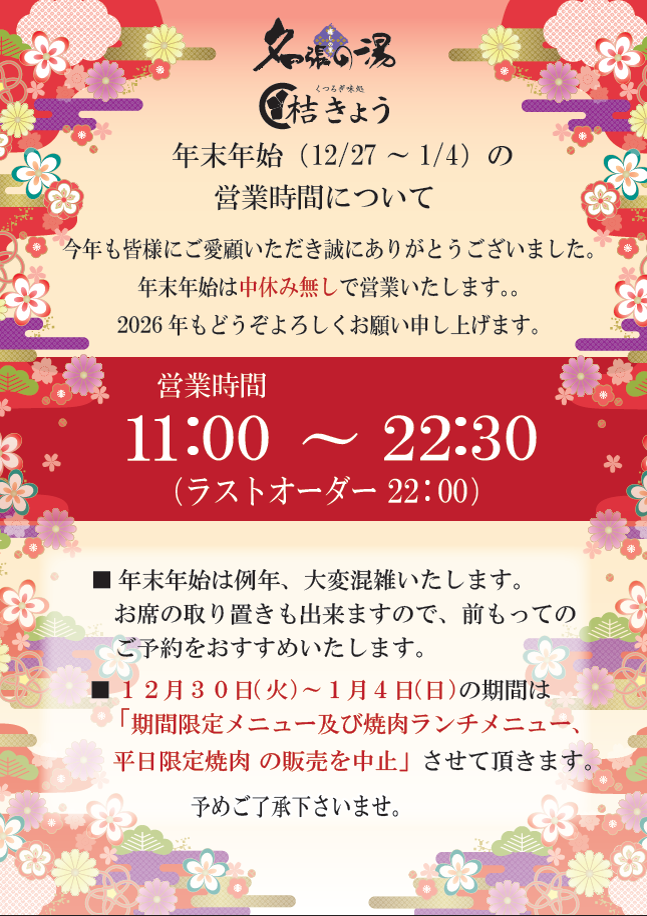 年末年始は、例年大変込み合います。 お席のみのご予約も可能ですので、スタッフまでお申し付けください。 (すでにお取りできない時間帯もございます) 営業案内 ・12/27~1/4まで中休み無しの営業です ・12/30~1/4は「焼き肉ランチ」「期間限定メニュー」「平日限定焼き肉盛合せ」の販売は中止いたします