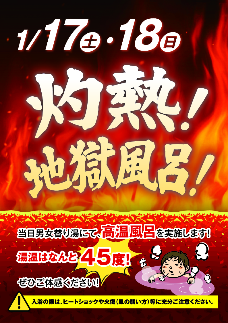 当日男女替り湯にて、高温風呂を実施します!